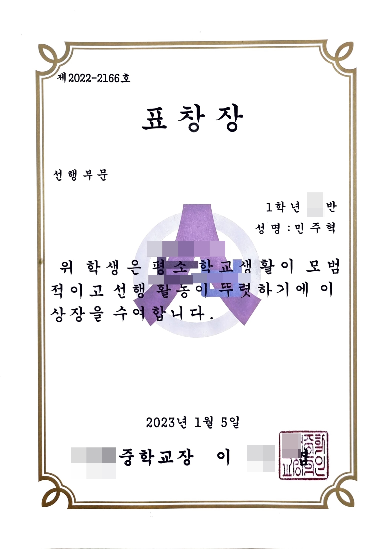 평소 학교 생활이 모범적이고 선행 활동이 뚜렷하기에 이 상장을 수여한다고 적혀 있다.