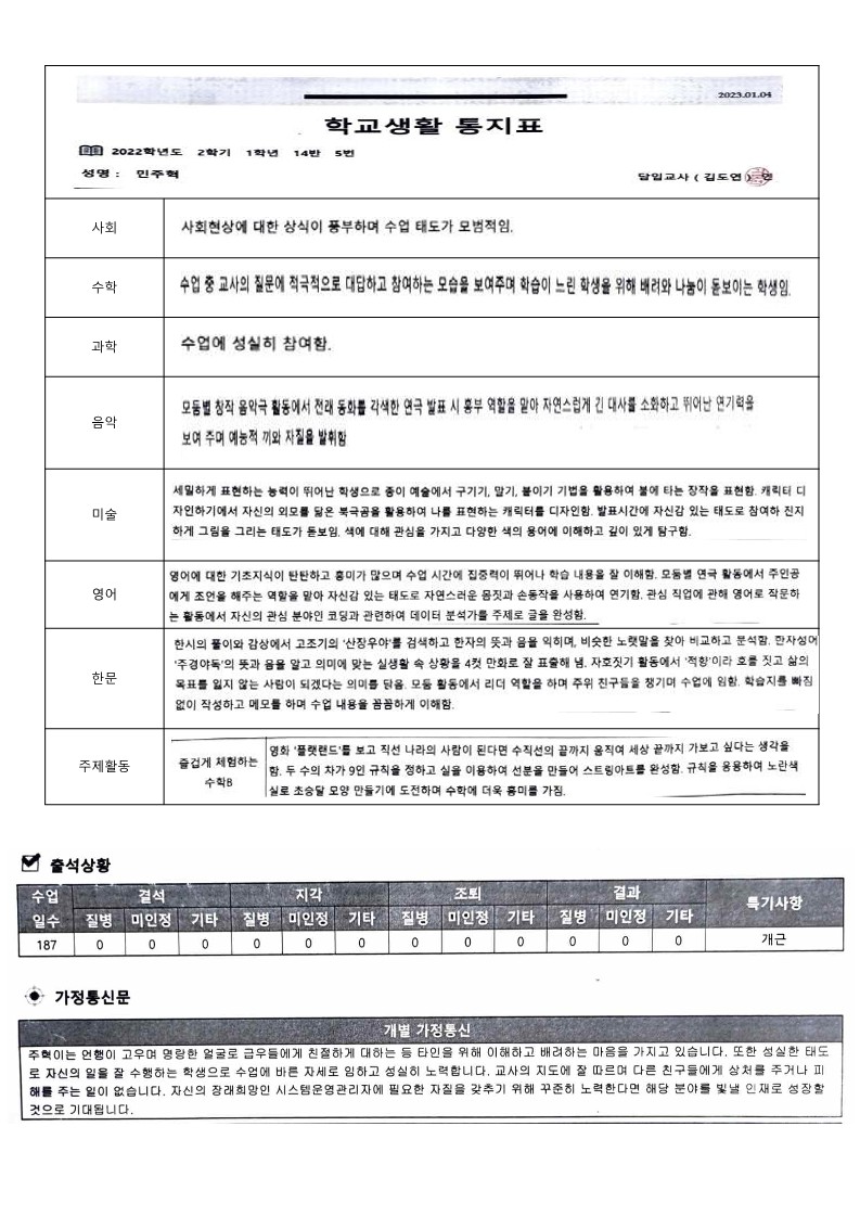 아이가 학교에서 생활통지표를 받아왔는데 너무나 흡족하게 받아왔다. 하긴 매년 난 아이 통지표가 마음에 들었었다.