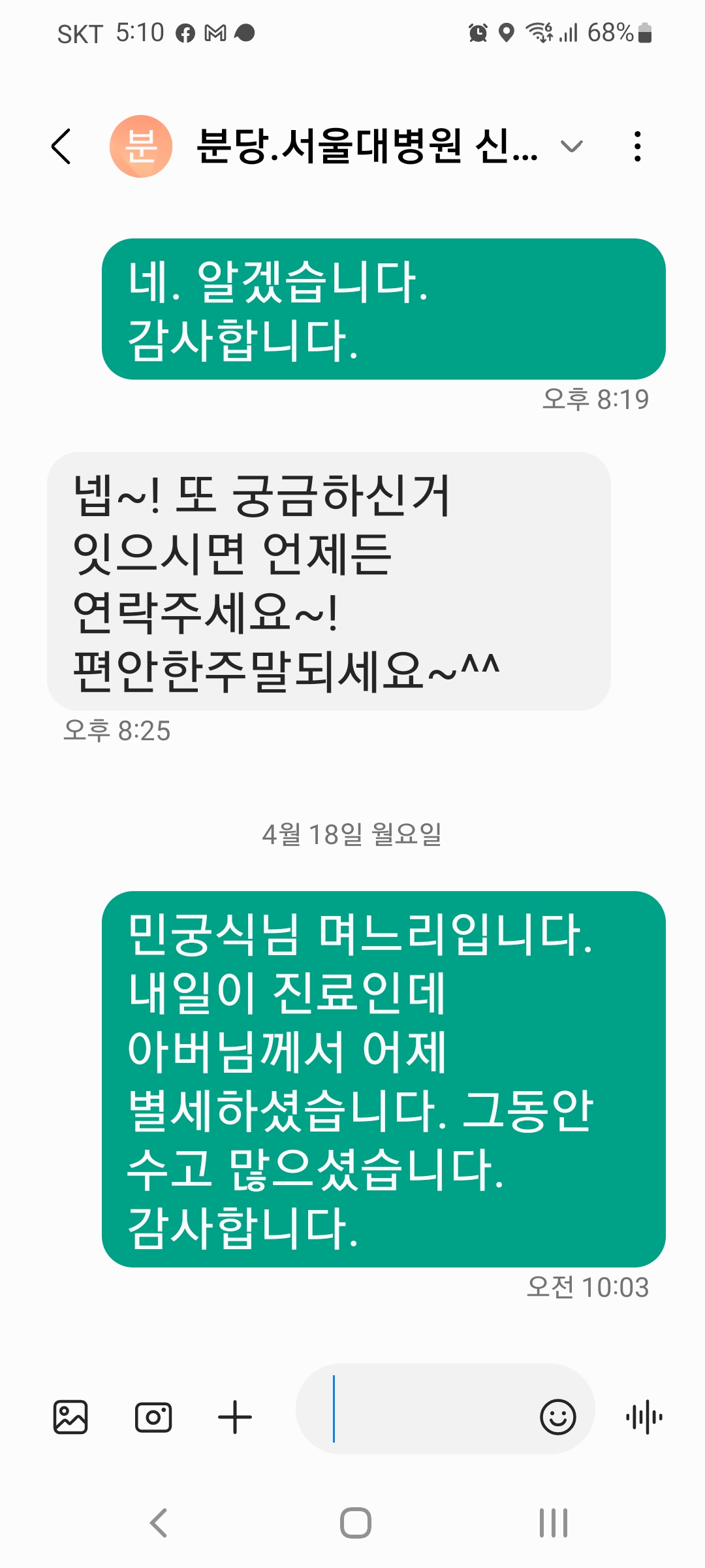 임상을 담당했던 간호사에게 문자를 했다. 바로 전화가 왔다. 너무 놀라서 전화했다며...